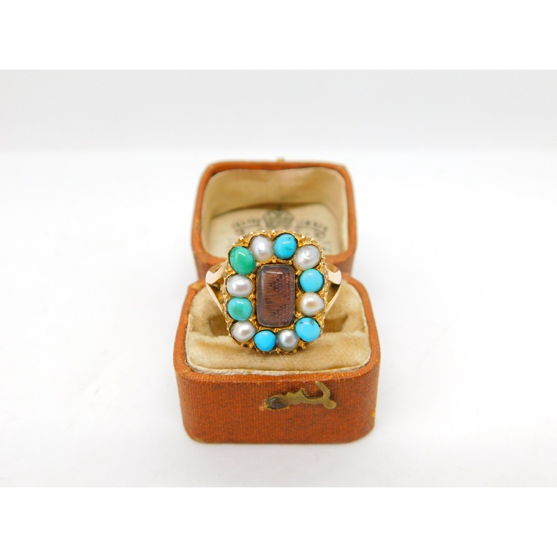 Details: A fantastic and wonderfully designed antique Victorian 9ct yellow gold mourning ring with woven hair surrounded by turquoise & pearls hallmarked 9ct to the interior c1840. This is a wonderful item that would make a perfect gift or addition to any