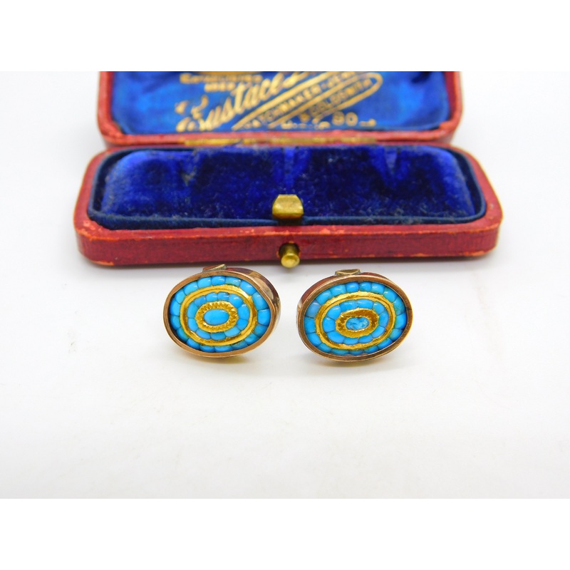 Details: A fantastic and wonderfully designed antique Victorian pair of 9ct rose gold mounted stud earrings, the earrings set throughout with blue turquoise with layers of 24ct yellow gold interspersed. The gold has been XRF tested, dates c1880. Slight bend to one of the back studs. This is a wonderful item that would make a perfect gift or addition to any collection. The BOX pictured is for PRESENTATION ONLY and is NOT included in the listings but used to frame the pictures unless specifically stated otherwise.