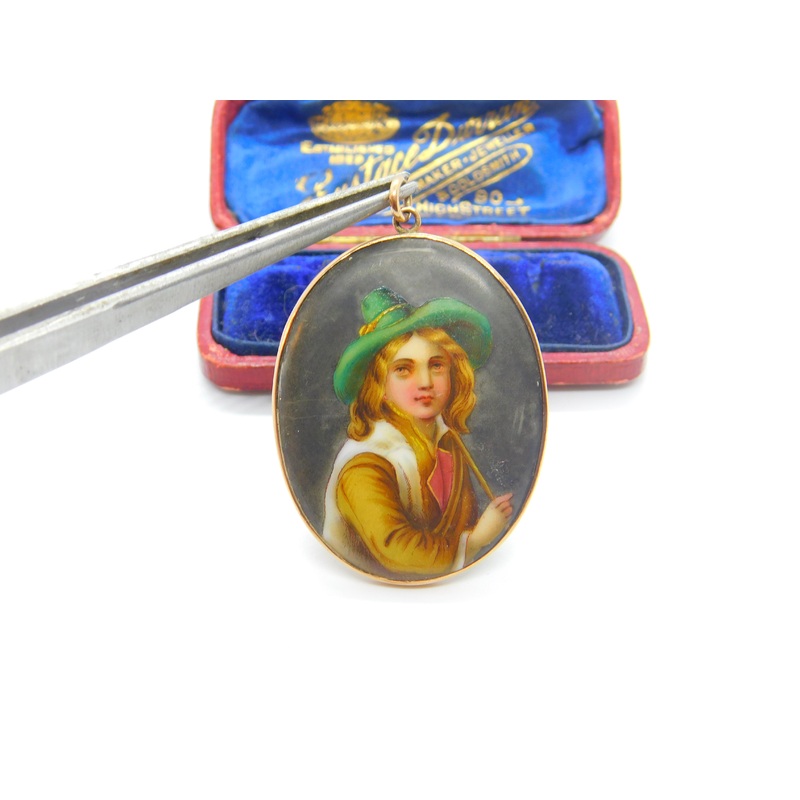 Victorian 9ct Rose Gold Mounted Painted Porcelain Portrait Pendant Antique c1880