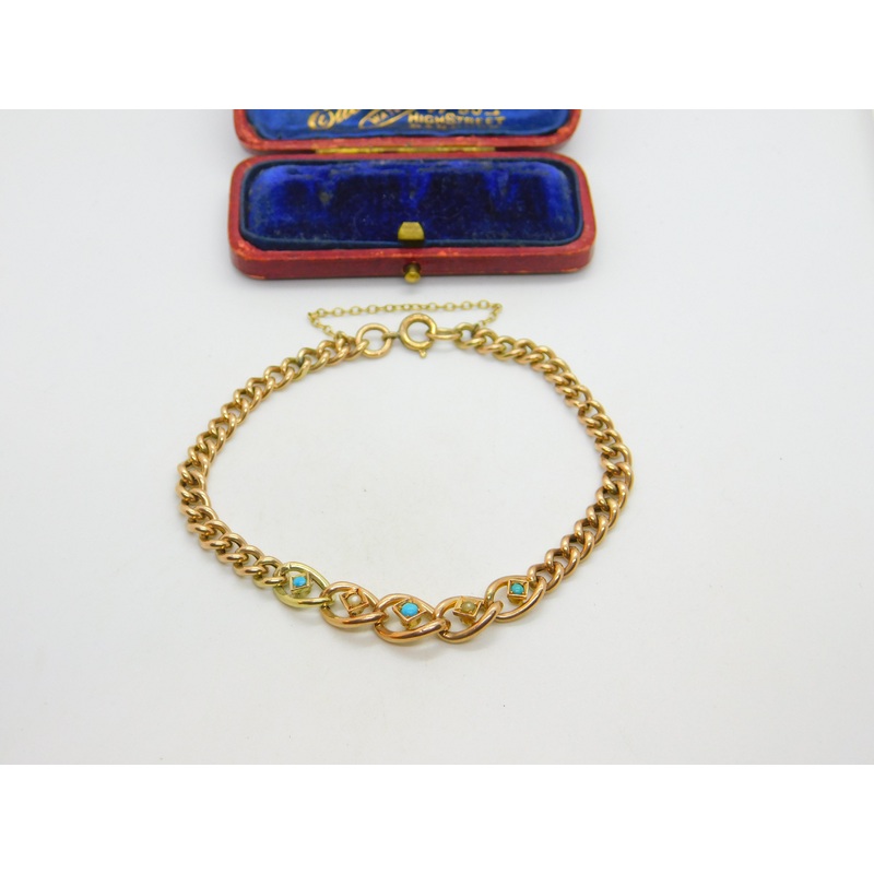 Details: A fantastic and wonderfully designed antique Victorian 9ct rose gold graduating curb link chain bracelet set with turquoise & seed pearls hallmarked to the bale and XRF tested c1880. A gorgeous bracelet. This is a wonderful item that would make a perfect gift or addition to any collection. The BOX pictured is for PRESENTATION ONLY and is NOT included in the listings but used to frame the pictures unless specifically stated otherwise.