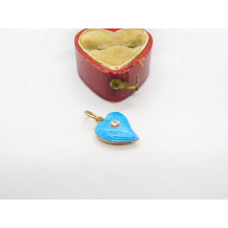 Details: A fantastic and wonderfully designed antique Victorian 9ct yellow gold and blue guilloche enamel witches heart with 0.1ct diamond set to the centre c1860. The gold has been XRF tested - a superb example. Small nibble to the right edge of the ename