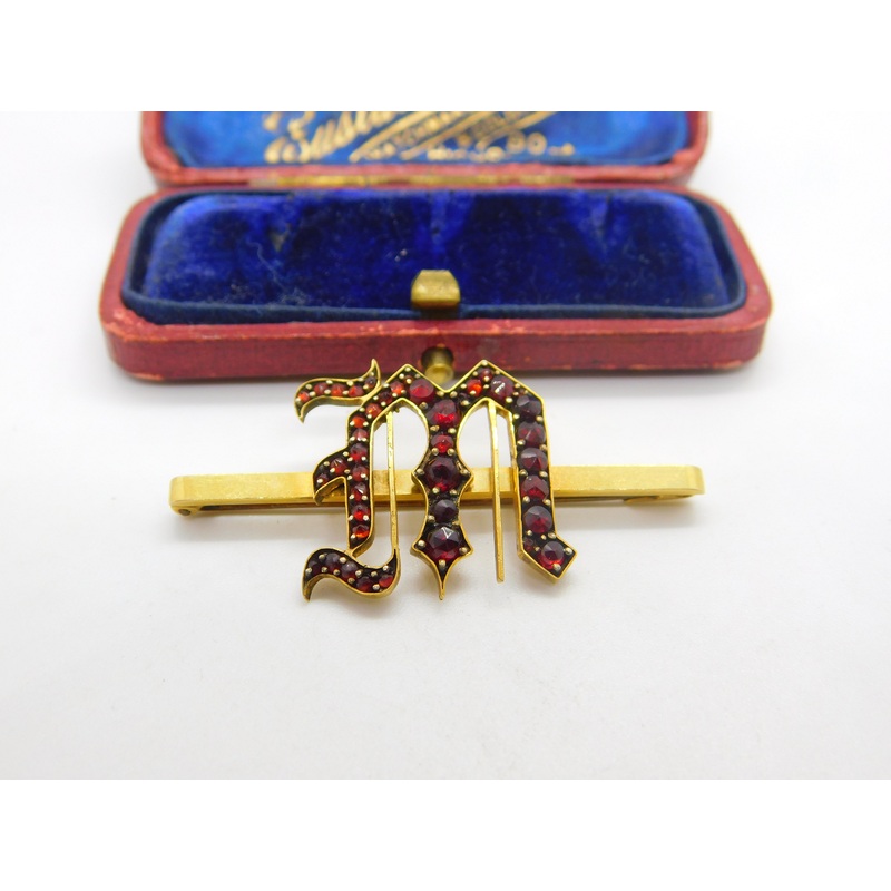 Simply stunning deep red garnet stones to this antique 9ct yellow gold initial brooch or pin dating from the mid Victorian period. The stones are set to form the letter 'M', all the stones are present, in good order considering age and use and have been te