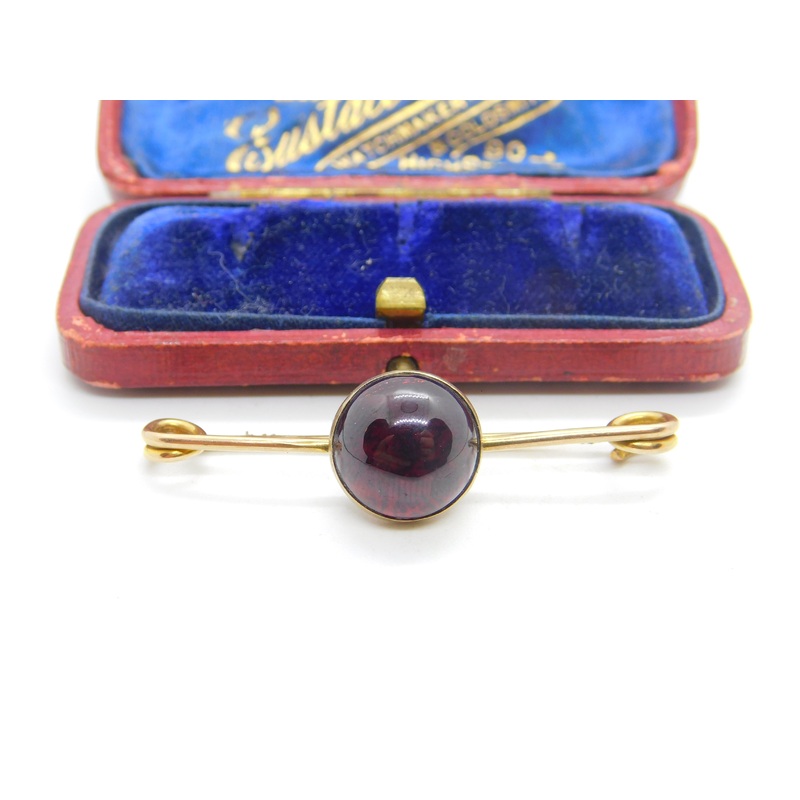 Details: A fantastic and wonderfully designed antique Victorian 9ct yellow gold bar brooch set with cabochon almandine garnet stone hallmarked Chester 1901 to the pin. This is a wonderful item that would make a perfect gift or addition to any collection. T