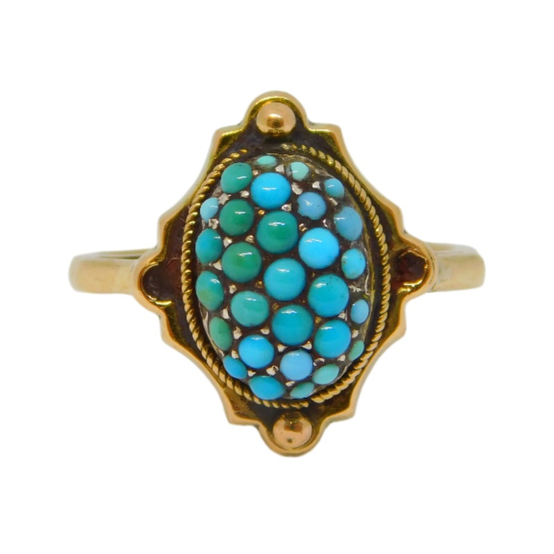 Details: A fantastic and wonderfully designed antique Victorian 9ct yellow gold dress ring with pave set turquoise throughout hallmarked to the interior band '9ct' c1890. This is a wonderful item that would make a perfect gift or addition to any collection