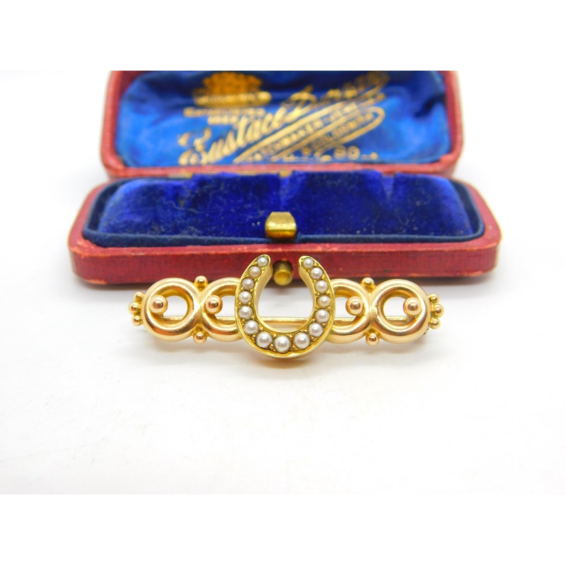 Details: A fantastic and wonderfully designed antique Victorian 9ct yellow gold and seed pearl set horseshoe form brooch with patent number to the reverse and XRF tested c1890. This is a wonderful item that would make a perfect gift or addition to any coll