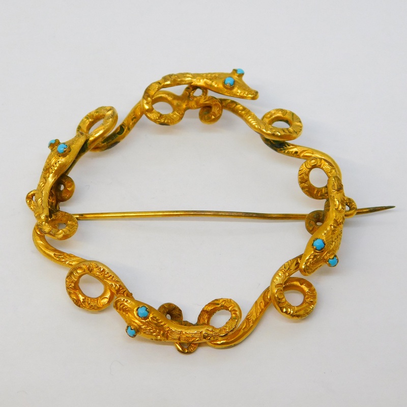 Details: A fantastic and wonderfully designed antique mid-Victorian 9ct yellow gold large sweetheart brooch depicting four entwined snakes set with turquoise to the eyes, the entwined snakes became a popular symbol of affection following the proposal of Qu