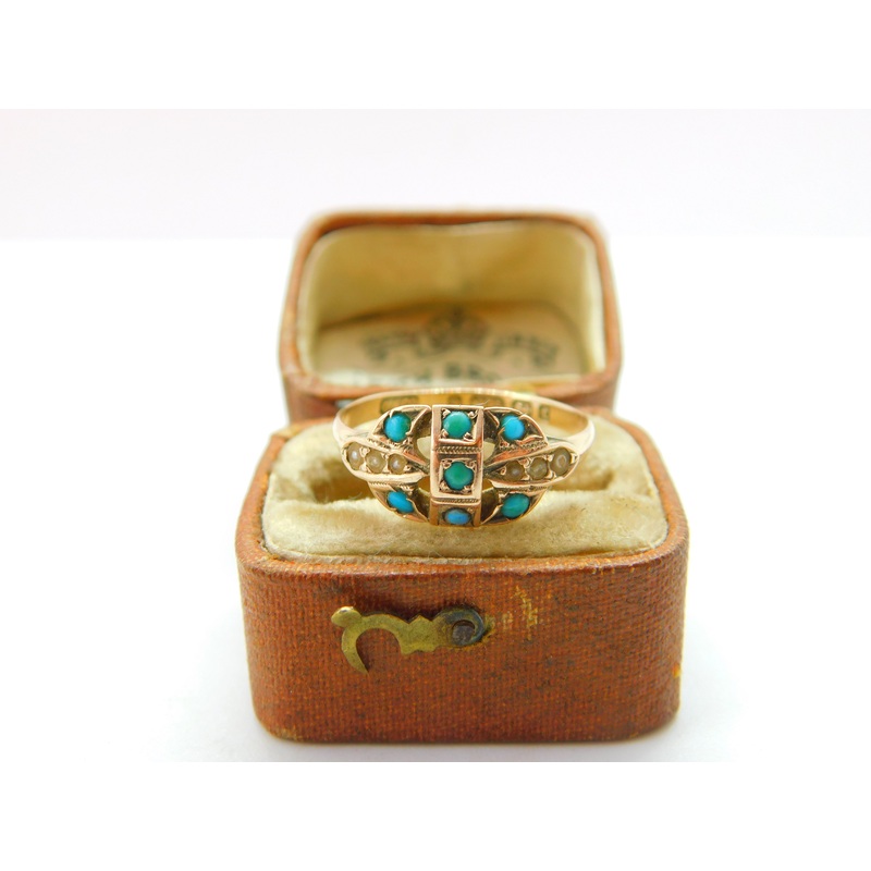 Details: A fantastic and wonderfully designed antique Victorian 9ct yellow gold dress ring set with turquoise and seed pearls with lovely detailing hallmarked Birmingham 1877 to the interior band. Minor wearing to the pearls but a nice ring. This is a wond
