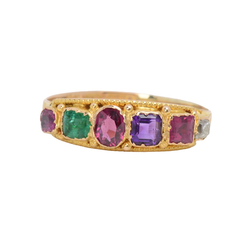 This is a ring where the first letter of the gemstone names spells out a word. Making it one of the most sought-after types of sentimental jewelry from the Romantic era of the Victorian span of years.
