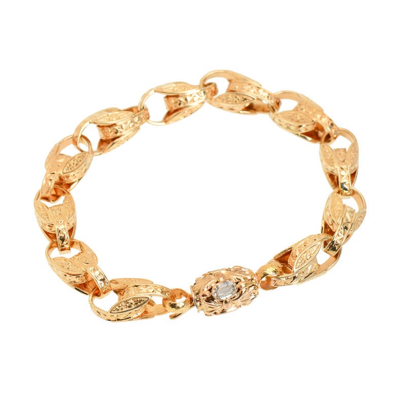 Eleven fancy links and a barrel clasp were designed in 9k soft-hued yellow gold.