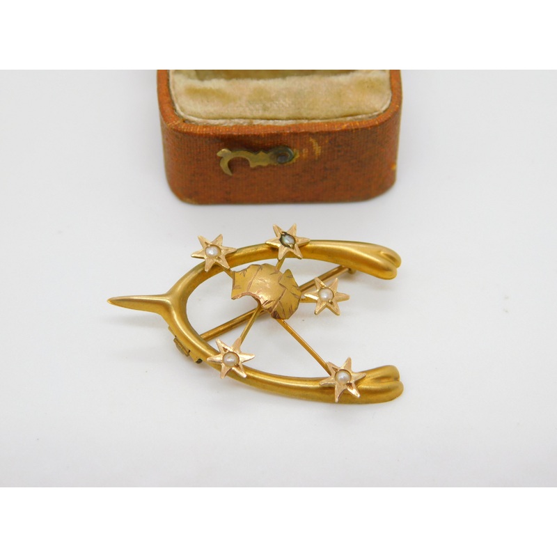 Details: A fantastic and wonderfully designed antique Victorian Australian 9ct yellow gold wishbone good luck brooch depicting an australian southern cross set throughout with seed pearls hallmarked to the reverse c1880 by Willis & Sons of Melbourne with u