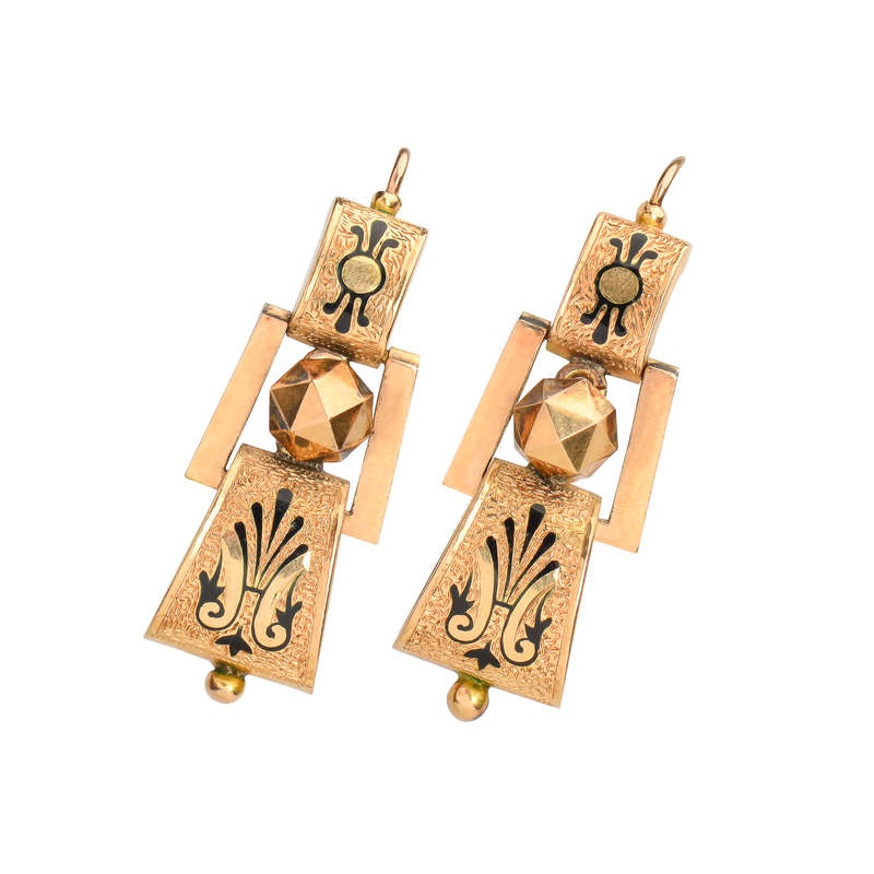 Dangling and geometric, these American Victorian earrings are constructed in four parts and a shepherd’s hook ear wire with safety clasp. The surmount is a convex and curved rectangular shape.