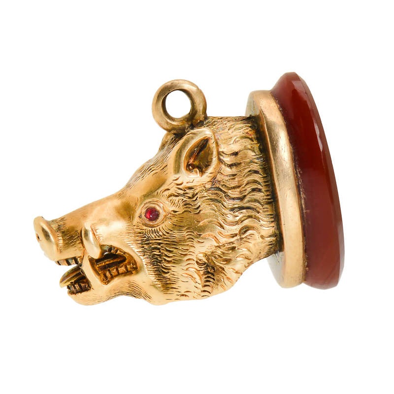 Generous in size and hefty, at over 20 grams, this imposing fob of 14k gold and carnelian takes the form of a fierce and powerful wild boar’s head.
