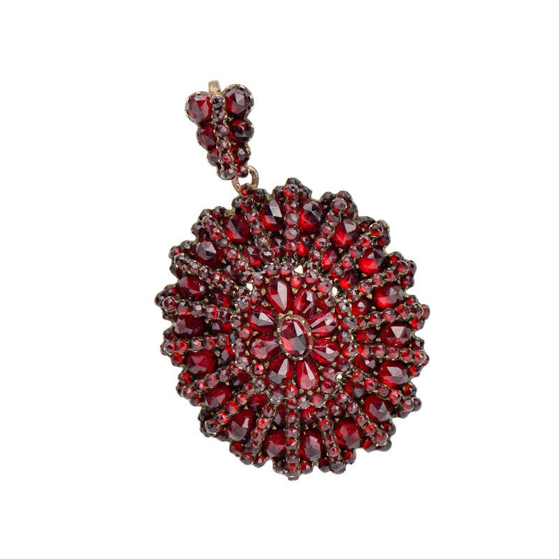 A wondrous dome shape is built up from tiers of Bohemian garnets in creation of this marvelous locket pendant.