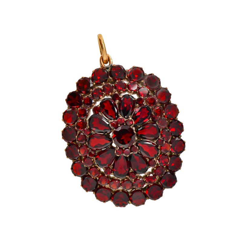 Exploding with color, this unusual pendant is a stand-out among the usual. This Bohemian pendant locket comes alive with large and juicy pyrope garnets.