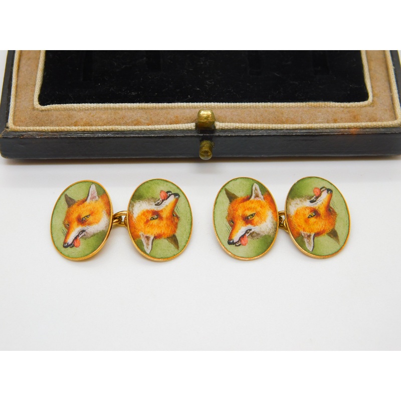 Details: A fantastic and wonderfully designed boxed pair of Victorian 18ct yellow gold and enamel gents cufflinks depicting fox masks with beautiful colour and detail both hallmarked to the reverse c1880. The cufflinks are included within the original box