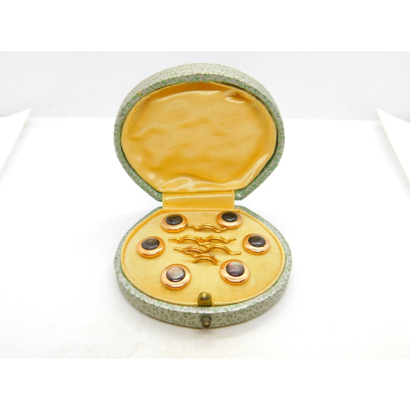 Details: A fantastic and wonderfully designed antique Victorian boxed set of rolled gold and cats eye or abalone buttons or studs c1880. This is a wonderful item that would make a perfect gift or addition to any collection.