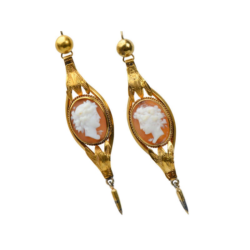 Jewelry of the Victorian age was awash with symbolism and many of the pieces carried either a symbolic or sentimental message. This pair of three-part earrings from circa 1870 portrays the goddess Flora in carefully carved shell cameos.Cameos are images in