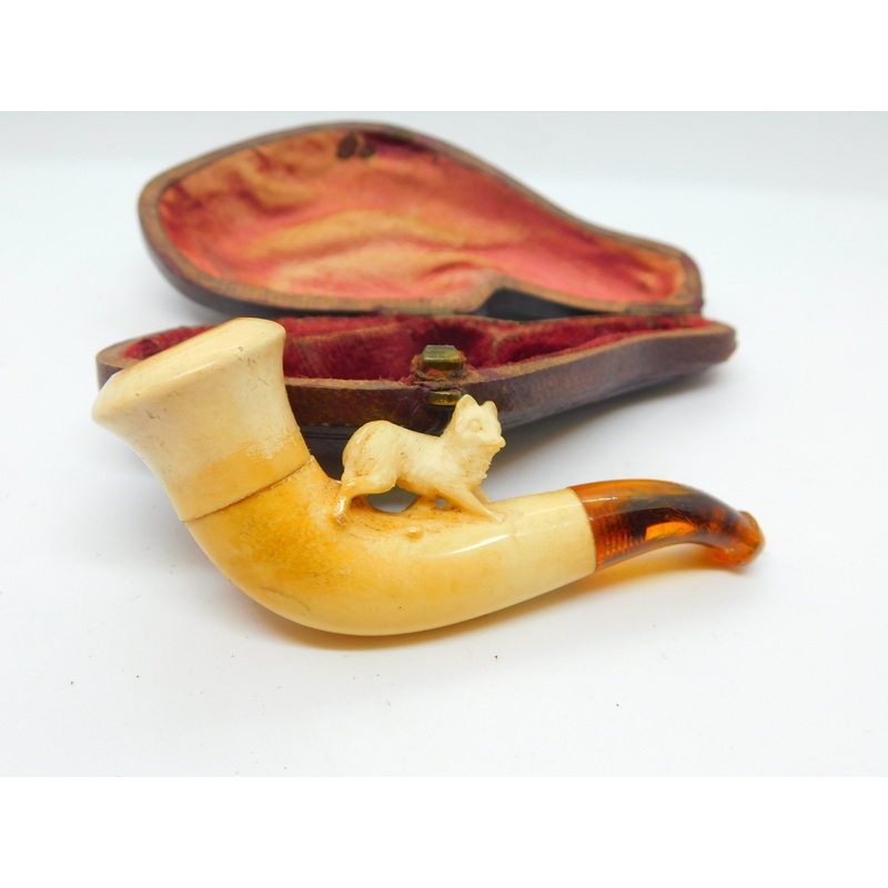 Victorian Cased Meerschaum Block Amber Novelty Fox Pipe Antique c1860