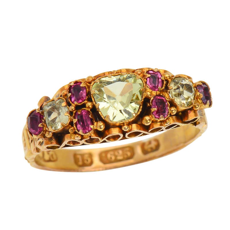A classic example of a type of mid-19th century English ring is this one created with chrysoberyls and red-colored paste stones.