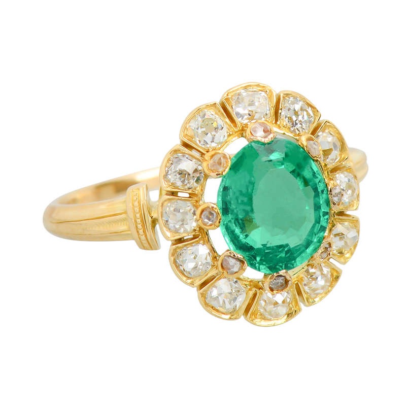 An oval faceted gemstone is set with eight rose-cut diamond-set prongs. A rim of open work transitions to a scalloped perimeter of old mine and cushion cut diamonds. The 18k yellow gold set the entire ring ablaze.