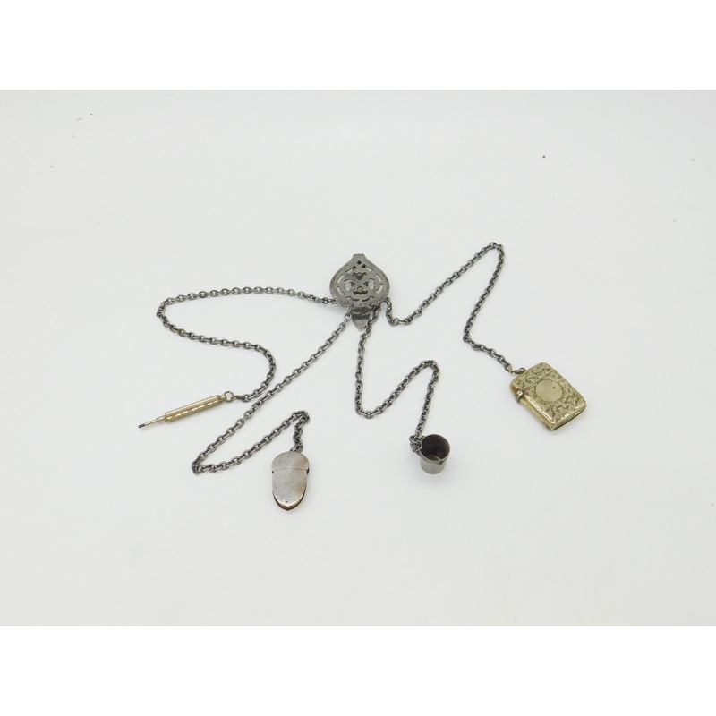 Details: A fantastic and wonderfully designed antique large Victorian cut steel sewing chatelaine with multiple tools to include pin cushion, thimble bucket, vesta case and more c1860. This is a wonderful item that would make a perfect gift or addition to
