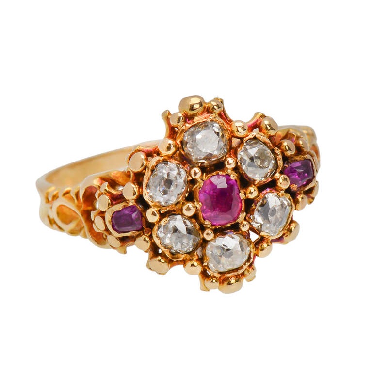 A beautiful locket-back flower or cluster regales us with natural red rubies and old mine cut diamonds.In 18k yellow gold, six chunky old mine cut diamonds add .48 carats to the ring. Their color of K-M imparts soft shimmer (clarity of SI1-3).Three rubies