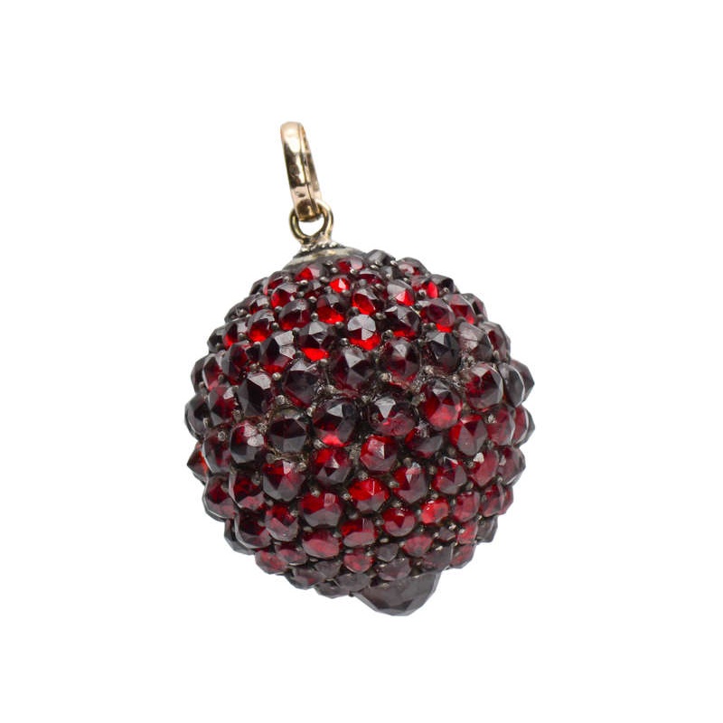 A larger garnet rests at the bottom and note how they graduate in size from larger in the middle to smaller at each “pole’.