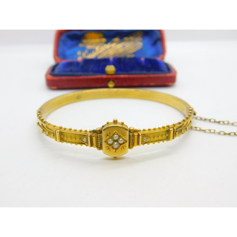 Details: A fantastic and wonderfully designed antique Victorian 15ct yellow gold etruscan bangle bracelet set with seed pearls c1860, the gold has been XRF tested. The bangle has a repair to the reverse of the central area. A stunning bangle notwithstanding. This is a wonderful item that would make a perfect gift or addition to any collection. The BOX pictured is for PRESENTATION ONLY and is NOT included in the listings but used to frame the pictures unless specifically stated otherwise.