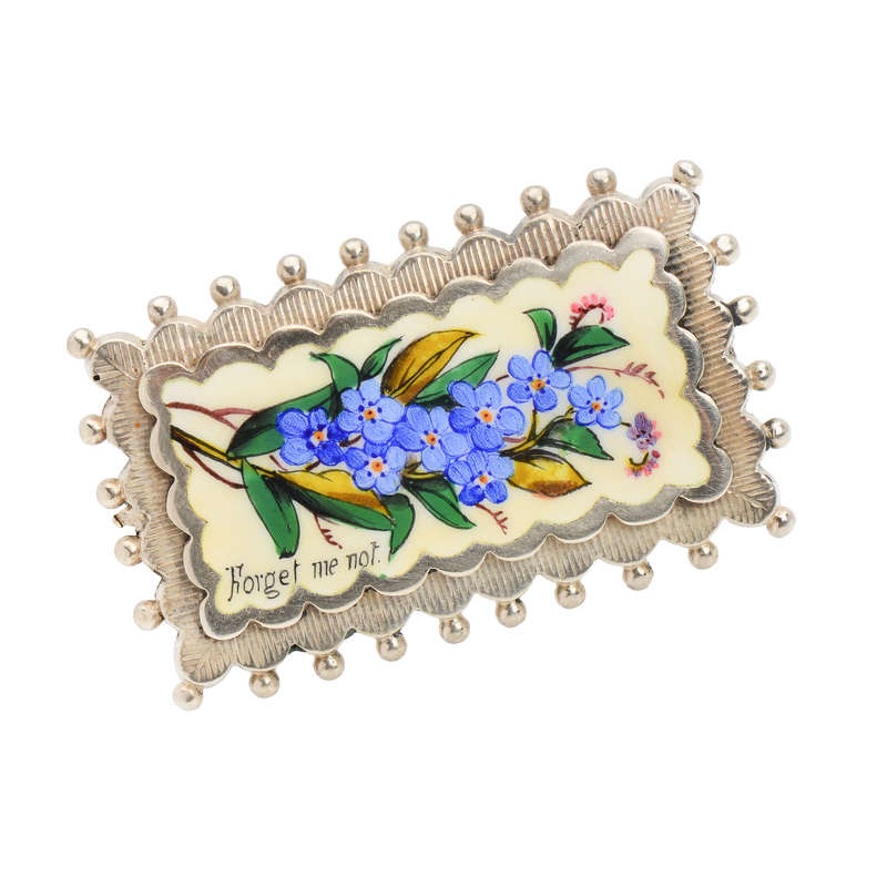 The words “Forget me not” sit to the lower left. In sterling silver, this Victorian brooch’s middle and outer areas’ scalloped edges impart an undulating impression. On the lower level, engraved parallel lines enhance the beaded rim, common to many pieces of Victorian jewelry from this period.
