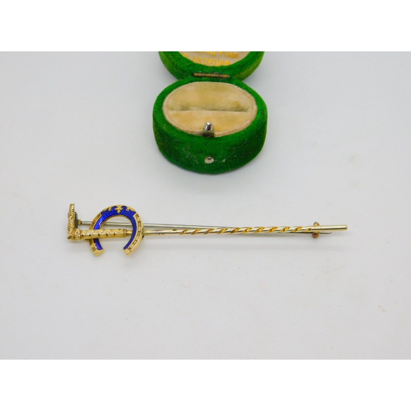 Details: A fantastic and wonderfully designed antique Victorian french 18ct yellow gold long bar brooch or stock pin in the form of a hunting crop and blue enamel adorned lucky horseshoe c1860. The gold has been XRF tested as it is unmarked. The horseshoe