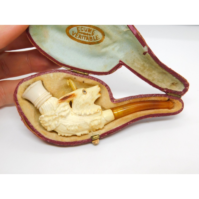 Details: A fantastic and wonderfully designed antique Victorian cased French meerschaum & block amber novelty smoking pipe in the form of a goat with superb detailing c1900 by Ecume Veritable. This is a wonderful item that would make a perfect gift or addition to any collection.