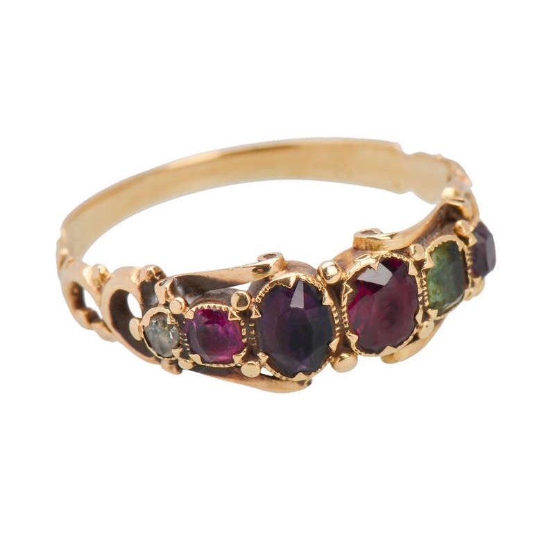 Set with all natural gems, a Ruby, Emerald, Garnet, Amethyst, Ruby, and Diamond, spell out the secret code. Set into a pleasing gallery adorned with “S” curves, the ring dates to circa 1850.