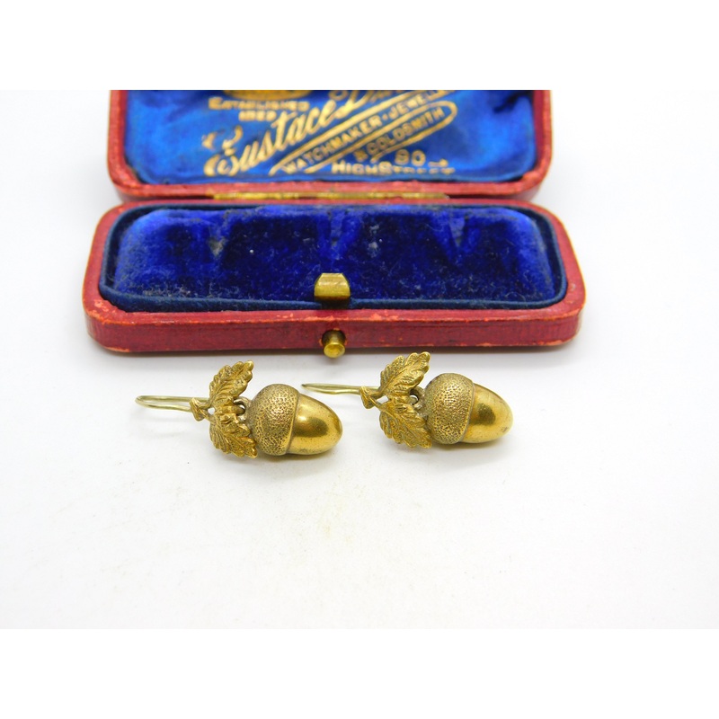 Details: A fantastic and wonderfully designed antique Victorian gilt metal hook or drop earrings in the form of acorns with leaves to the top c1860. This is a wonderful item that would make a perfect gift or addition to any collection. The BOX pictured is