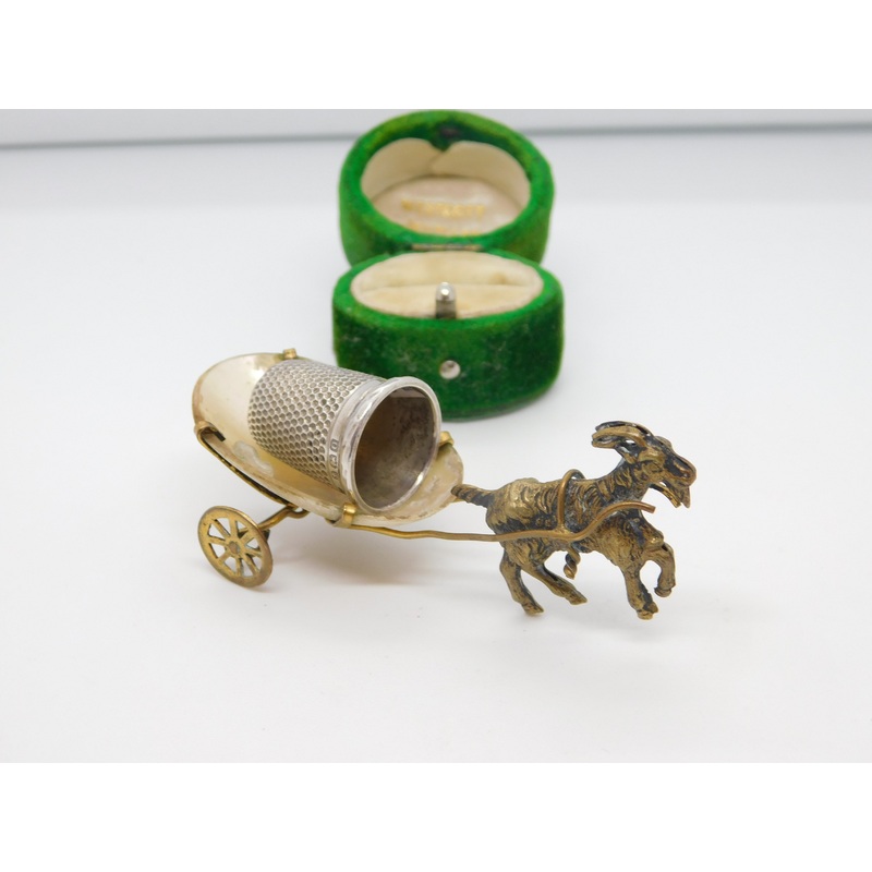 Details: A fantastic and wonderfully designed antique Victorian gilt metal & pearl goat cart thimble holder with lovely detailing c1890. This is a wonderful item that would make a perfect gift or addition to any collection. The BOX pictured is for PRESENTA