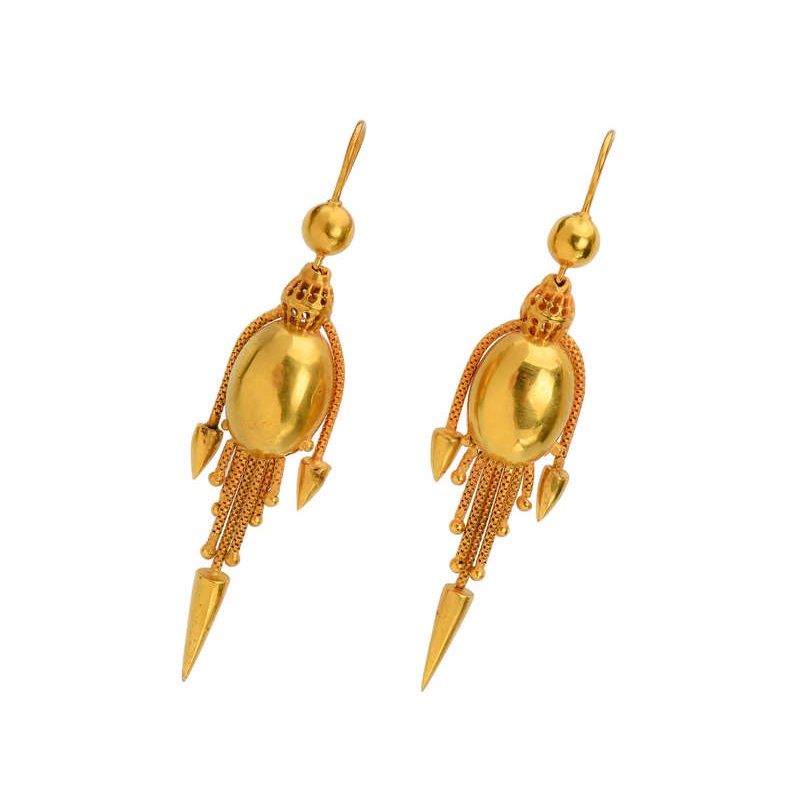 If you consult the highly regarded book, "Earrings from Antiquity to the Present" by Mascetti and Triossi, you will note that the 1870s was the era of fringe, fringe and more fringe in jewelry.Coming down to us from 150 years ago, is this pair of 15k yello