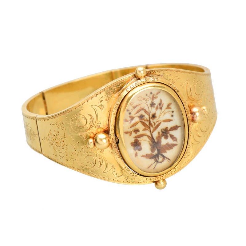 The bracelet’s tapered sides are shaped and hollow panels of gold hand engraved with scrolling designs, flowers and tiny repeated designs. Ingenious, the bracelet is also adjustable for different sized wrists.