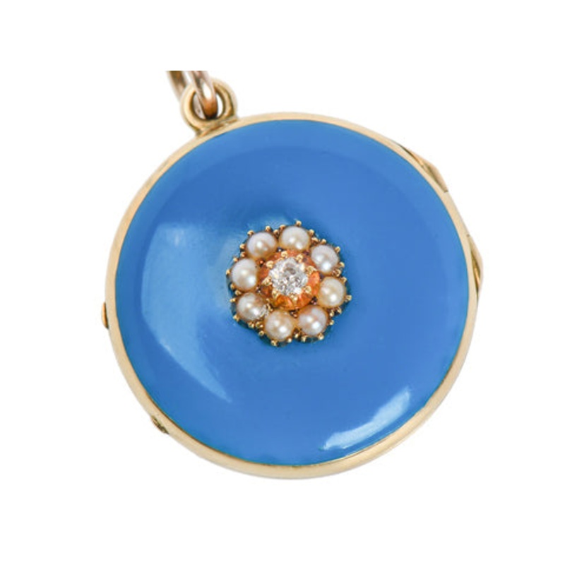 This particular example of 14k yellow gold is from the Romantic or early Victorian period. Round in shape with a slightly bulbous profile, the double-sided locket is enameled on both sides with a Spring turquoise blue.