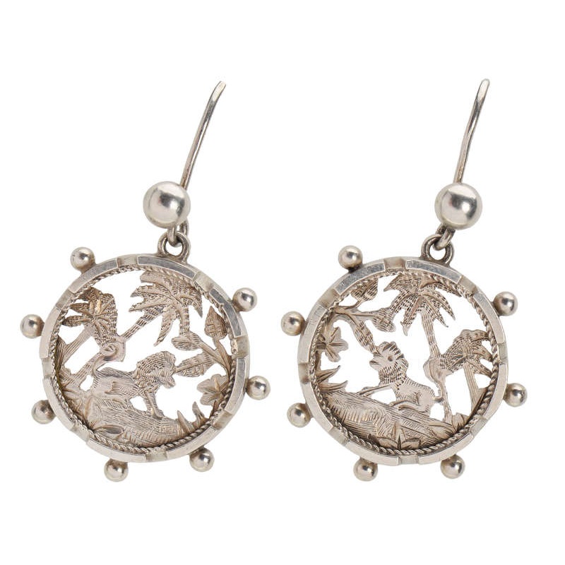 A scarce theme for Victorian silver jewelry, these whimsical sterling silver lion in the jungle motif earrings are fully hallmarked providing clues to their 142 old year history. In a rondel of silver, two palm trees and large and small leafy shrubs shade