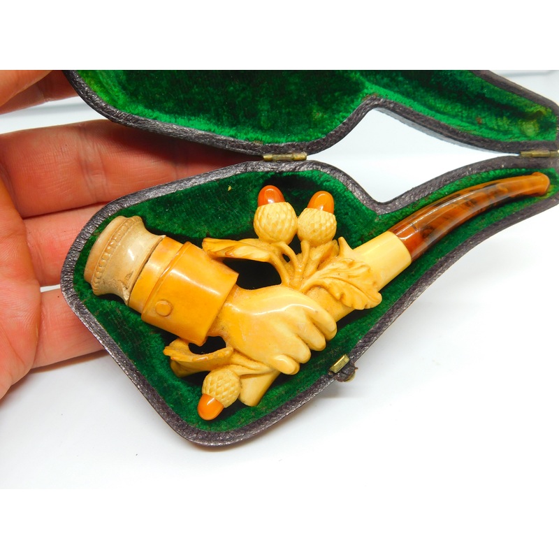 Details: A fantastic and wonderfully designed antique Victorian boxed meerschaum & block amber novelty smoking pipe in the from of a hand holding a bunch of lucky acorns c1860. Small chip to the meerschaum. This is a wonderful item that would make a perfec