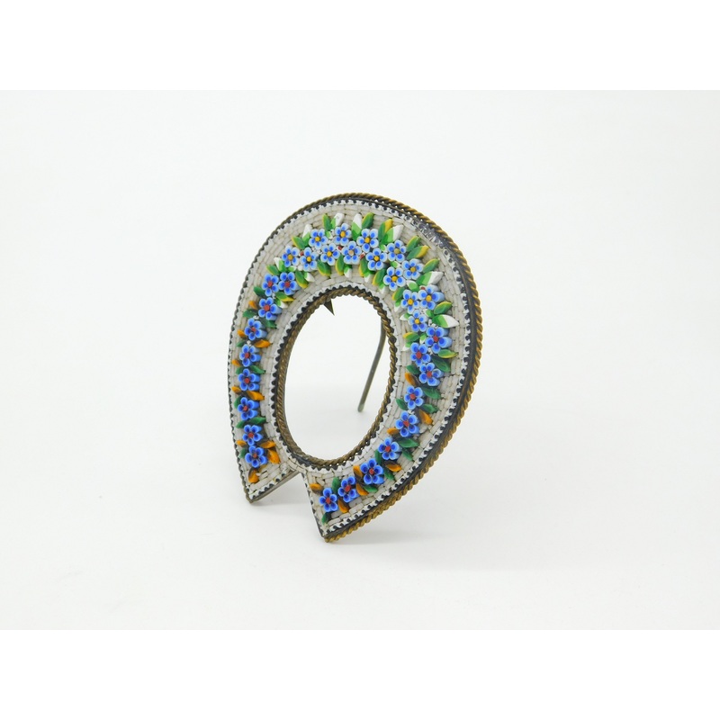 Details: A fantastic and wonderfully designed antique Victorian gilt metal horseshoe form frame with gorgeous floral forget-me-not micro-mosaic throughout c1860 - missing glass but a simply wonderful example. This is a wonderful item that would make a perf