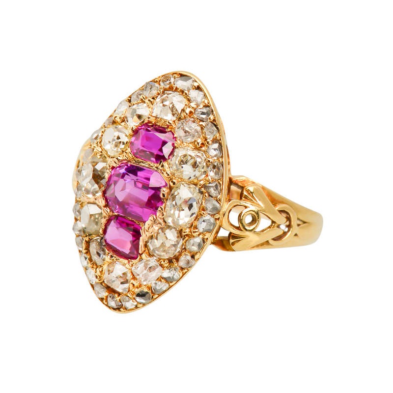 Sensuous, tactile, and visually captivating, three natural no-heat Burmese in origin rubies define a color stripe amidst antique, conflict free diamonds.Arranged in a plump marquise shape, a total of 3/4 of a carat of hot pink, Burmese ruby gemstones are n