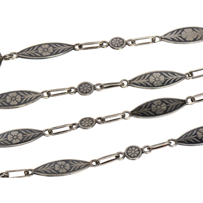 Here the process is displayed on a silver long chain circa 1880. Quite unusual as the fancy chain uses three types of links – a marquise shape, a small round medallion and an elongated elliptical link. A floral motif and stylized leaves appoint the marquise element and a multi-petal flower cluster decorates the round link.
