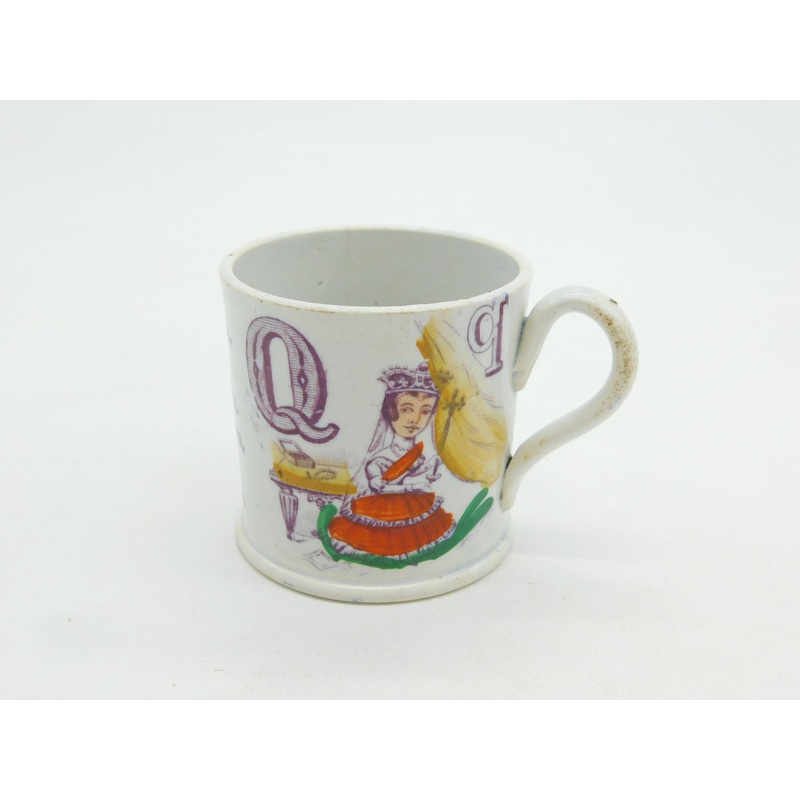 Details: A fantastic and wonderfully designed antique early Victorian transferware ceramic novelty teacup with colourful images depicting Robert Peel & Young Victoria with 'Pwas a Prson and wore a black gown. Qwas a Queen and lov'd a fine crown'. Nice cond