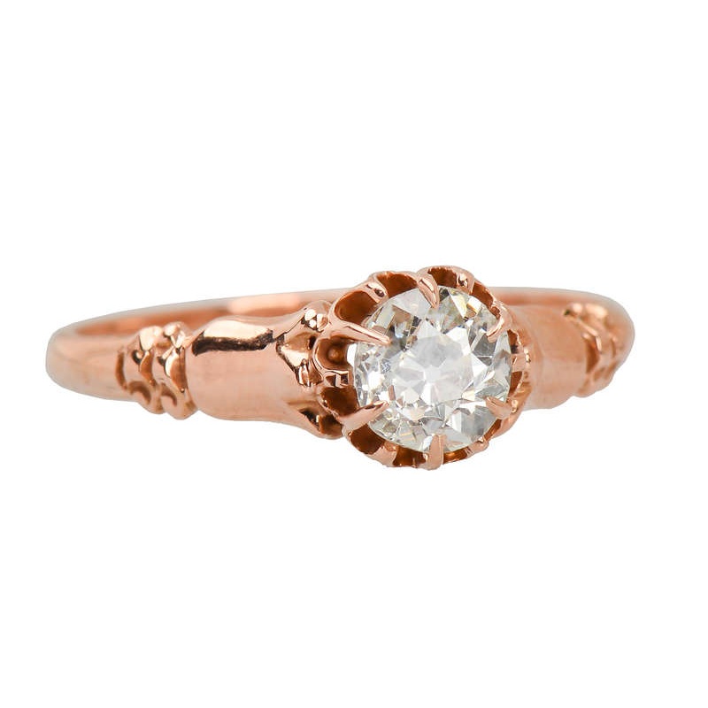 The crown shaped setting used during the mid to later Victorian years is a uniquely American design. When viewed closely, the arches of gold, both long (for the prongs) and short (for aesthetics) create a beautiful backdrop for this antique late Victorian