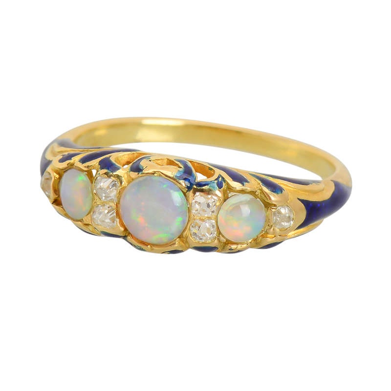 Cobalt blue enamel enlivens the opals and diamonds in a memorable ring.