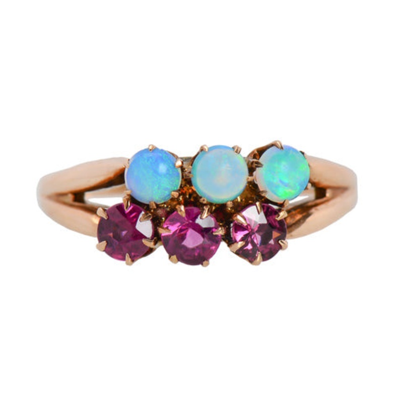 An antique Victorian ring of 10k rose gold imparts double delight with two rows of gems.A trio of grape colored round faceted almandine garnets, total of .35 carats plays off against three white opal cabochons with lively blue green hues, total of .25 cara