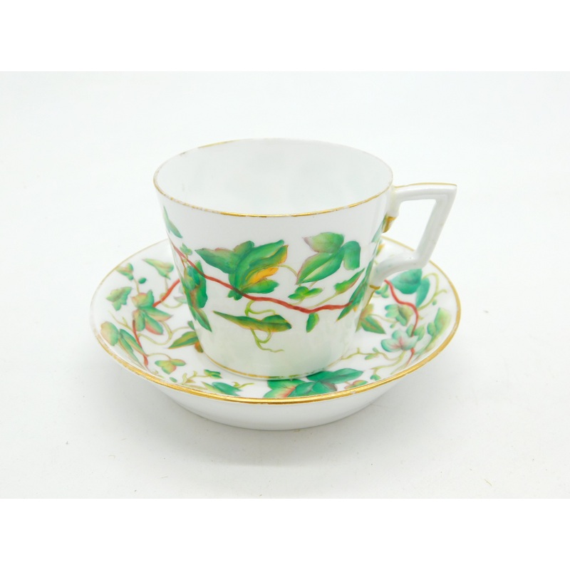 Details: A fantastic and wonderfully designed antique Victorian hand painted china teacup and saucer with charming leaf patterns and gilding c1880. The saucer features a super presentation inscription to the base for a Mrs Tickelpenny from Alice Sheldon on