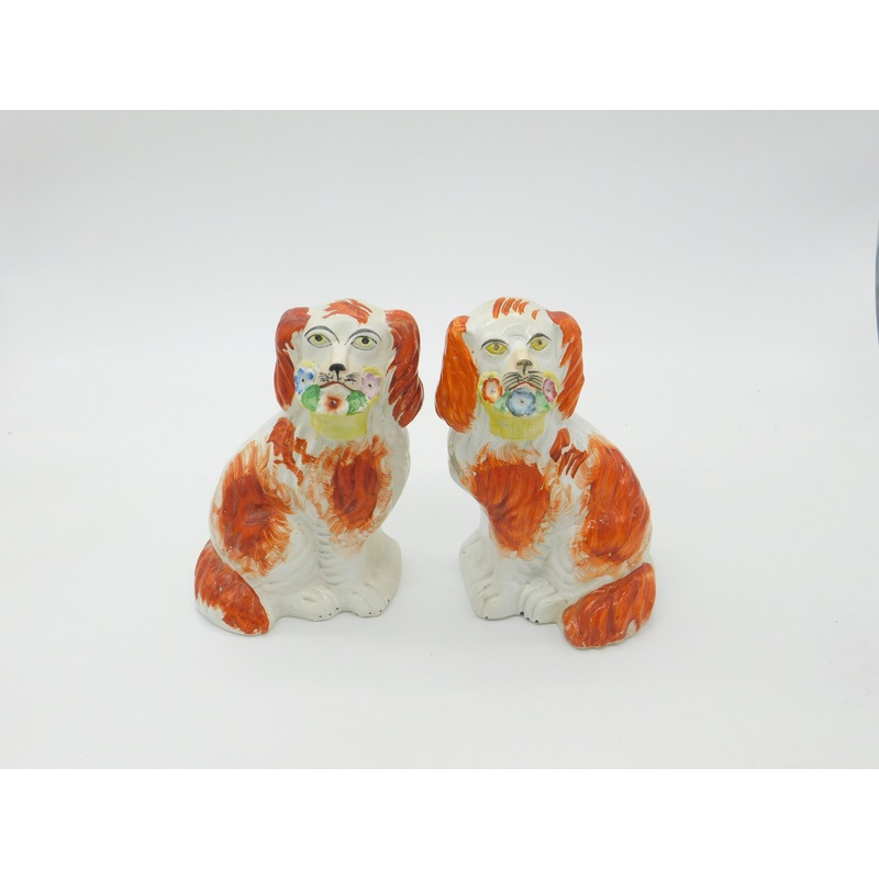 Details: A fantastic and wonderfully designed pair of antique Victorian Staffordshire pottery spaniels with flower baskets to the mouths hand painted with great colouring c1860. This is a wonderful item that would make a perfect gift or addition to any col
