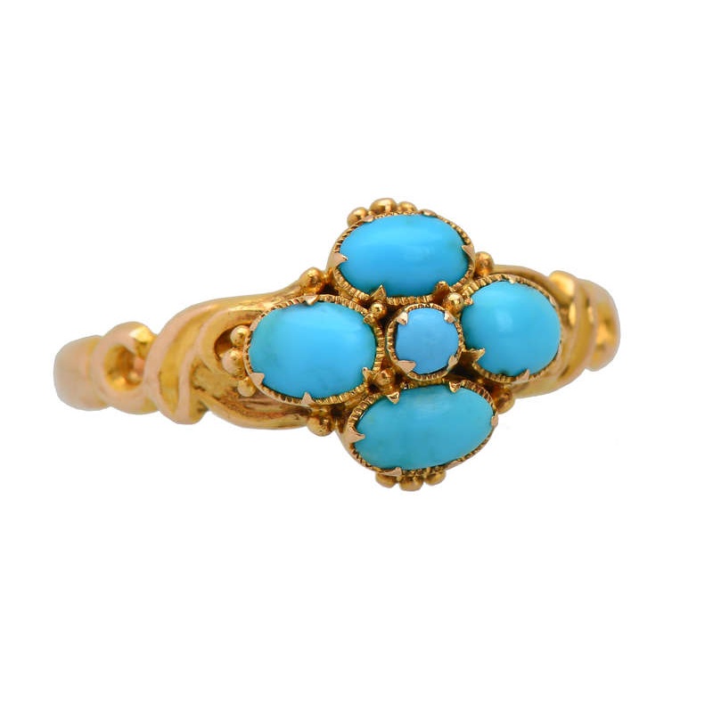 From the Romantic Era of the early days of the Victorian period comes a 15k yellow gold ring set with natural Persian turquoise. Robin's egg blue and free of blemishes, five gemstones form a flower or cluster. Each is surrounded by tiny granulated beads of