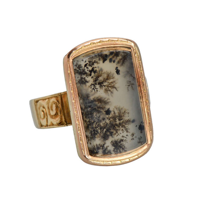 A Rorschach test in an intriguing tableau, a miniature garden “grows” on your finger. In 10k yellow gold, the 13 x 10 mm flat cabochon of moss agate is set within a simple bezel of gold.